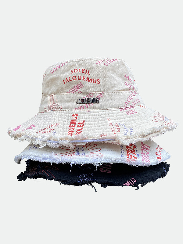 Sonnenfester Fischerhut mit buntem Aufdruck und rohem Besatz