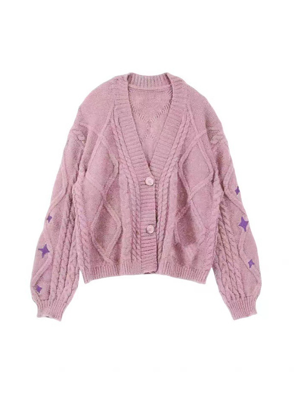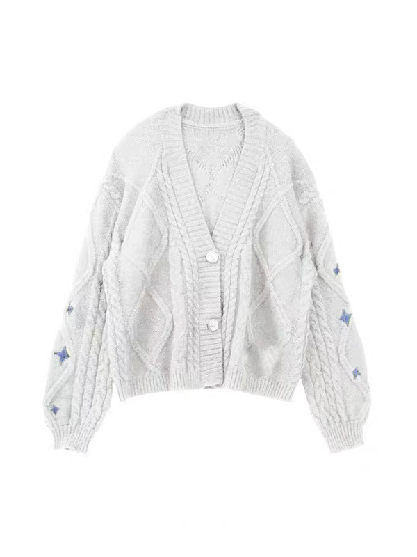 Zopfstrick-Cardigan mit V-Ausschnitt und Stern-Stickerei