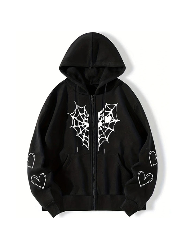 Übergroßer Kapuzenpullover mit Herz-Spinnennetz-Print für Herren und Reißverschluss