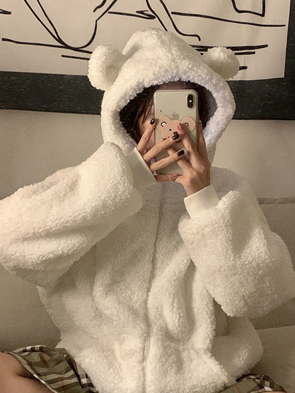 Niedliche Ohr-Kapuzen-Fleecejacke mit Reißverschluss