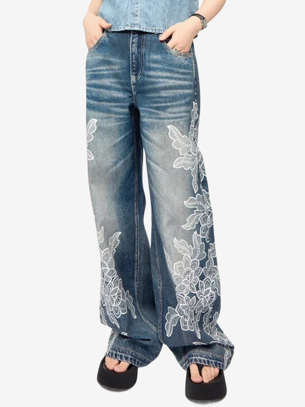 Stilvolle Loose-Fit-Jeans aus gewaschenem Denim mit Seitennaht-Imitat und 3D-Spitzendruck