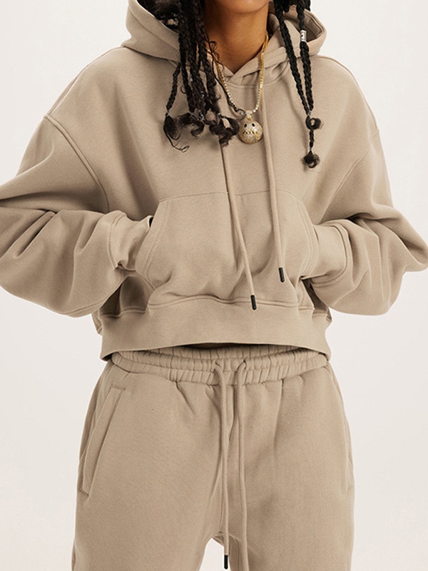 Einfarbiger, kurzer, übergroßer Kapuzenpullover mit Kängurutasche