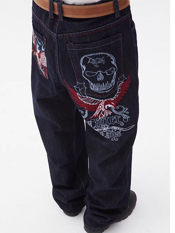 Lose Herrenjeans mit mehreren Taschen und buntem Aufdruck