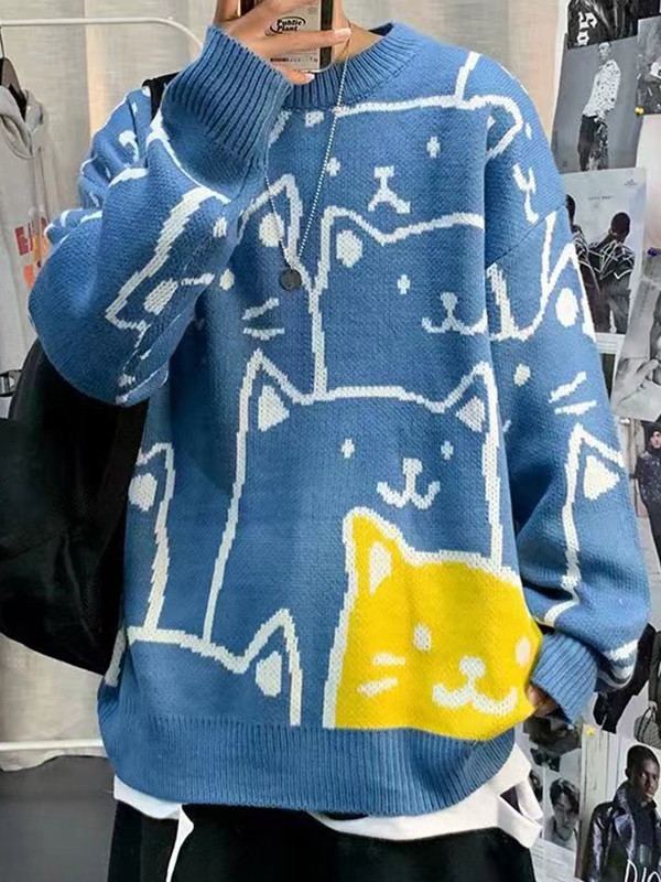 Jacquard-Pullover mit Rundhalsausschnitt für Herren mit Allover-Cartoon-Katzenmuster