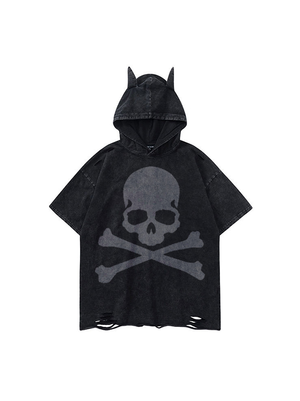 Übergroßes Langarm-T-Shirt mit Totenkopf-Kapuze für Herren
