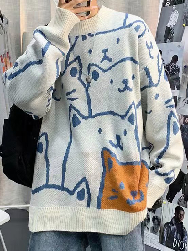 Jacquard-Pullover mit Rundhalsausschnitt für Herren mit Allover-Cartoon-Katzenmuster